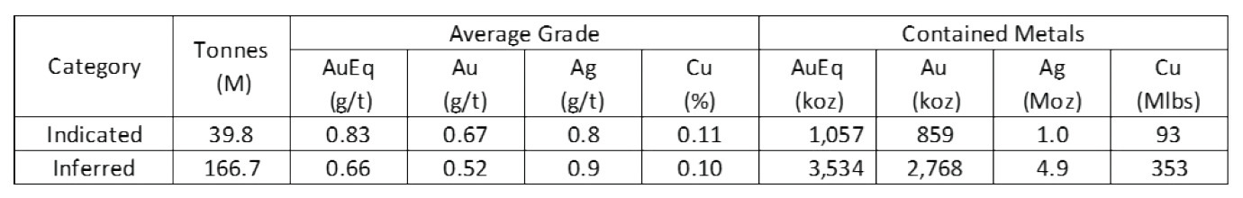 Multiple mineral resource estimates were completed following staged drilling programs by previous companies, which outlined a bulk tonnage gold-dominated porphyry gold-copper deposit. The latest mineral resource estimate(1)(2) for the Project was completed in 2021 by a previous owner, Luminex Resources, summarized in the table below.